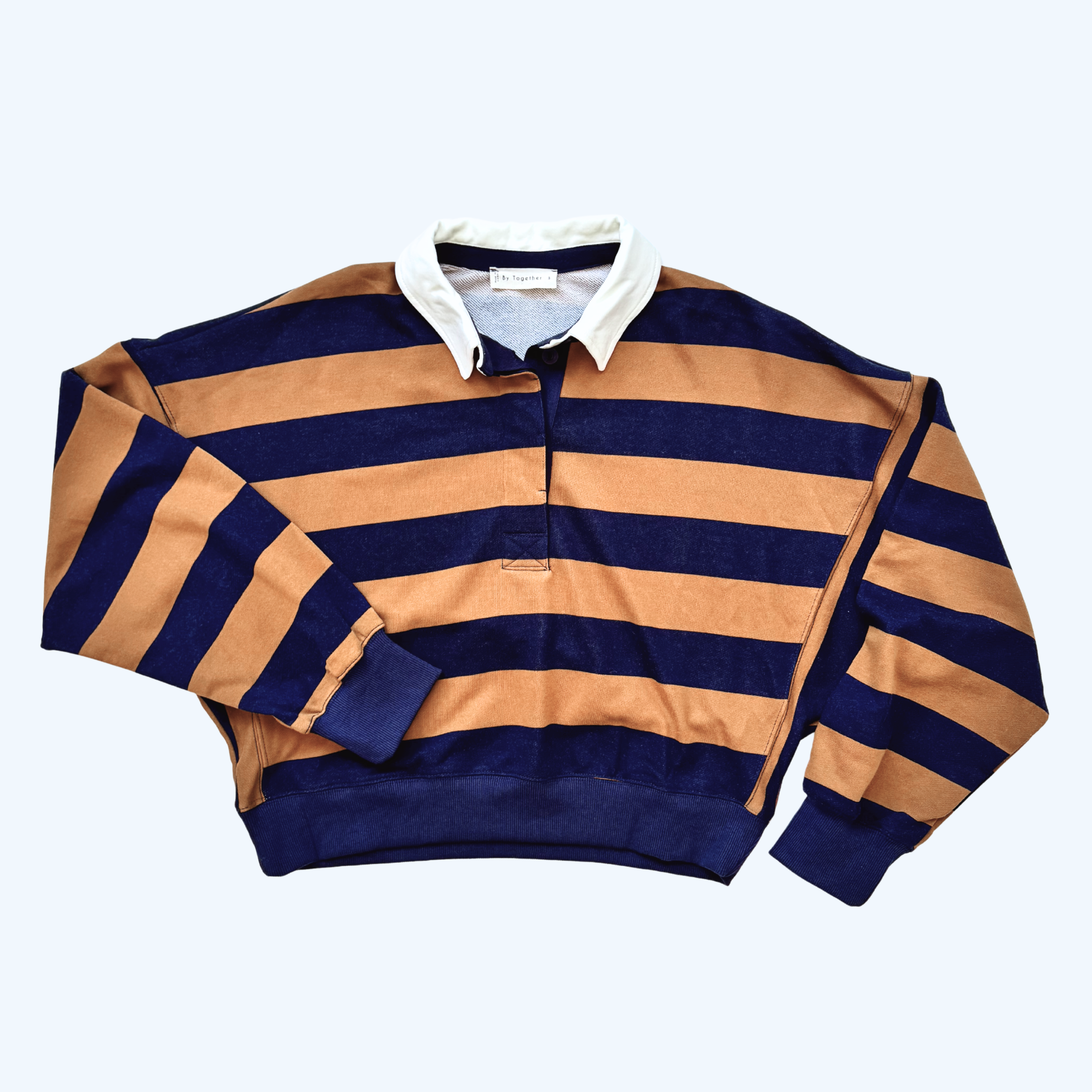 Step into classic fall style with this Rugby Striped Polo Shirt. Featuring bold camel & navy stripes with a crisp white collar, this half-button pullover blends timeless sporty style with modern comfort. Lightweight yet durable, it’s perfect for weekend adventures, casual outings, or layering on cooler days.